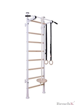 - Stały metalowy drążek do podciągania z 6 chwytami, kółka gimnastyczne oraz bawełniana lina z huśtawką. Ten drążek do podciągania został zaprojektowany do serii BenchK 2 i 7. Jest on trwale zamontowany na górze drabinek BenchK. Drążek do podciągania ma sześć uchwytów z powłoką antypoślizgową, co pozwala na szeroki zakres różnych typów podciągania, wzmacniania mięśni rdzenia, pleców i ramion. Ponadto, świetnie nadaje się do rozciągania kręgosłupa czy treningu mobilności gdy są do niego przymocowane taśmy oporowe. Kółka są wykonane ze sklejki bukowej i zawieszone na czarnych paskach. Polerowane do perfekcji, kółka są gładkie i bezpieczne dla rąk. Paski są wyposażone w klamry, które umożliwiają szybkie dostosowanie długości oraz łatwe ich zdjęcie. W miarę jak dziecko rośnie, kółka mogą być używane jako taśma TRX. Lina jest ręcznie spleciona w górnej części w formie pętli i zabezpieczona na samej dole, eliminując konieczność użycia metalowych lub plastikowych elementów. Może być używana do wspinaczki lub po dołączeniu drewnianego talerza zawartego w zestawie jako huśtawka.
