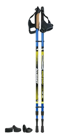 Wysokiej jakości, lekkie, aluminiowe, dwuczęściowe, składane kijki Nordic Walking marki Allright. Posiadają system amortyzujący wstrząsy - ANTI-SHOCK oraz możliwość jego wyłączenia. Ergonomiczna rękojeść pokryta została warstwą naturalnego korka oraz wyposażona w zapięcie na nadgarstek na rzep - tzw. rękawiczka. Dodatkowo w komplecie znajduje się zestaw nasadek.