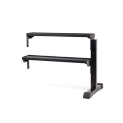 Poziomo zamontowane półki modułu stojaka mają długość 100 cm i wyłożone są gumową matą, która zapewnia dodatkową ochronę, amortyzację oraz stabilność akcesoriów na półkach, a także zmniejsza ryzyko wystąpienia potencjalnych uszkodzeń lub zarysowań w wyniku swobodnego przesuwania się sprzętu treningowego podczas pobierania i odkładania go na miejsce po zakończonym ćwiczeniu.